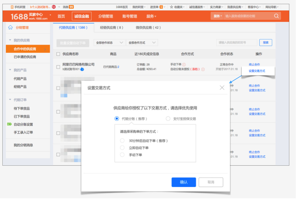 3、如果需要更改支付方式和下单方式,前往合作中的供应商,点击设置交易方式即可。