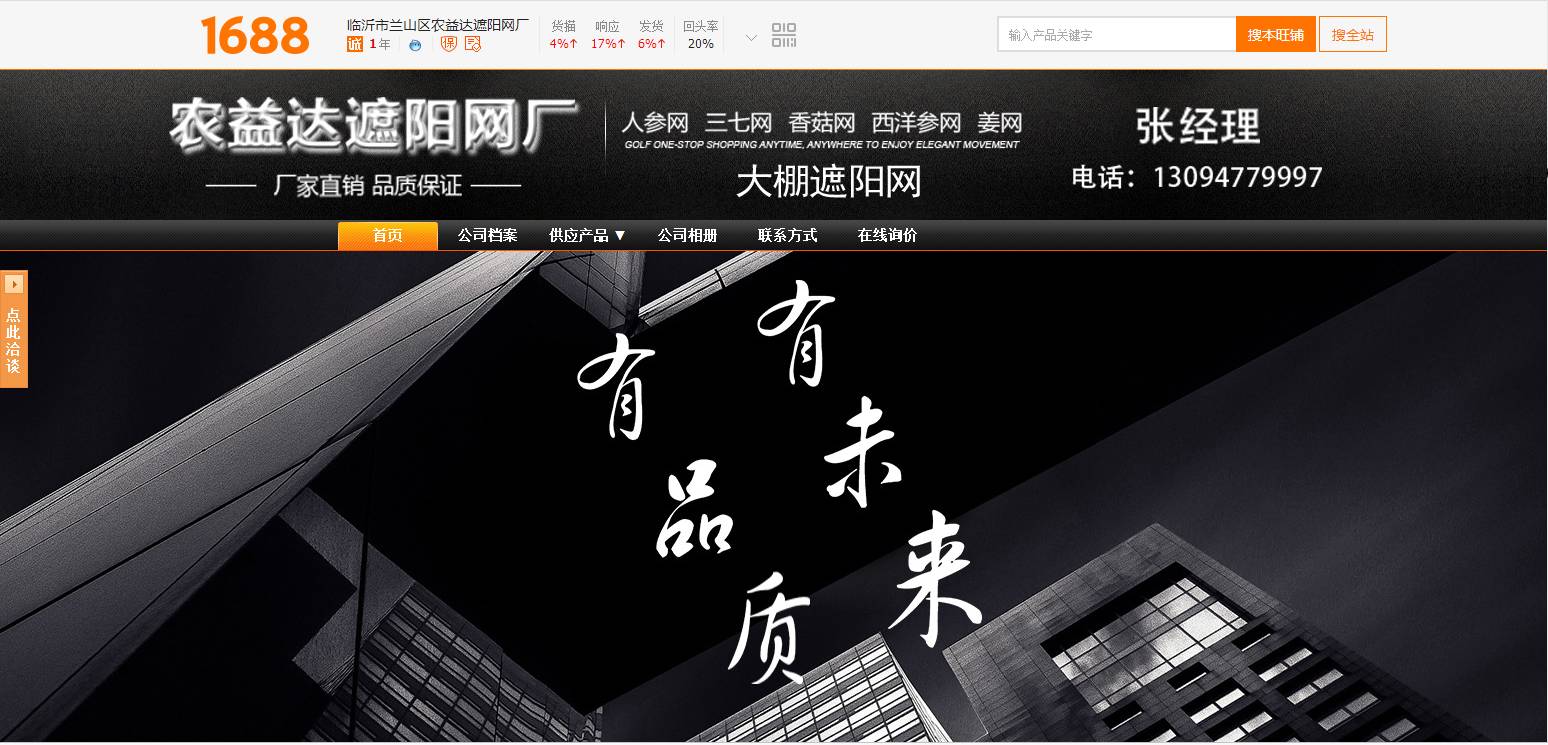 农益达遮阳网厂创建于90年代,原来生产基地位于浙江省台州市新河镇于2012年搬迁至山东省临沂市兰山区,我们从家庭作坊开始,经过10多年的发展,已稳步成为颇具规格的遮阳网厂家,本厂有先进的全套生产设备和专业的技术人员,企业附件有发往全国各地的物流公司,专业生产:人参网,三七网,姜网,香菇网,西洋参网等各类农用种植大棚网,可根据客户需要定制不同规格,产品经过抗紫外线,抗氧化检测,可保用4年以上。 农益达遮阳网厂坚持——”有质量有未来“——的经营理念为塑造一流的企业,培养一流的队伍,开发一流的产品,提供一流的服务将锲而不舍,永往直前,为开创企业更好明天而努力奋斗。农益达遮阳网厂——有质量有未来
