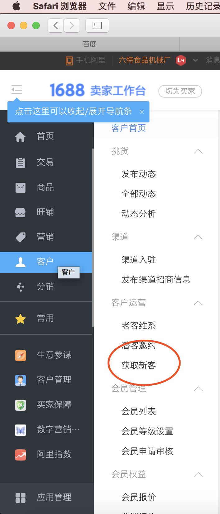 好了废话不多说,进入正题~,首先:第一步:打开手机阿里巴巴,第二步:点击赚元宝,进入里面的界面。 一、卖家赚元宝流量入口:打开1688工作后台操作界面 选取左边导航栏——客户 选取客户后点击——获取新客
